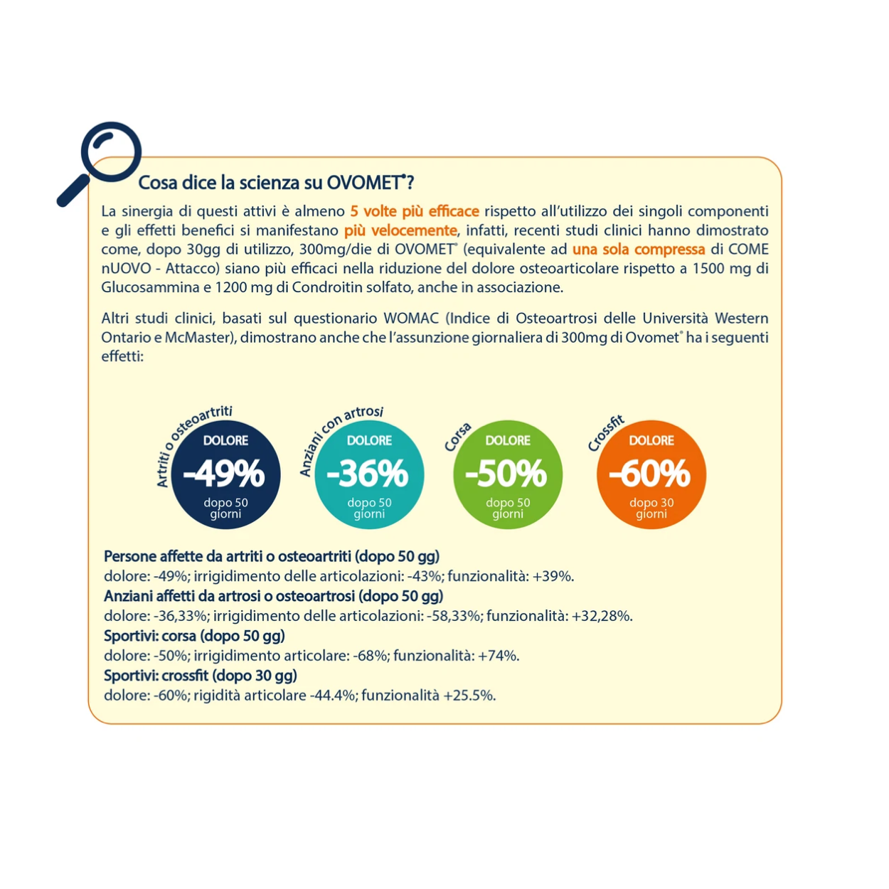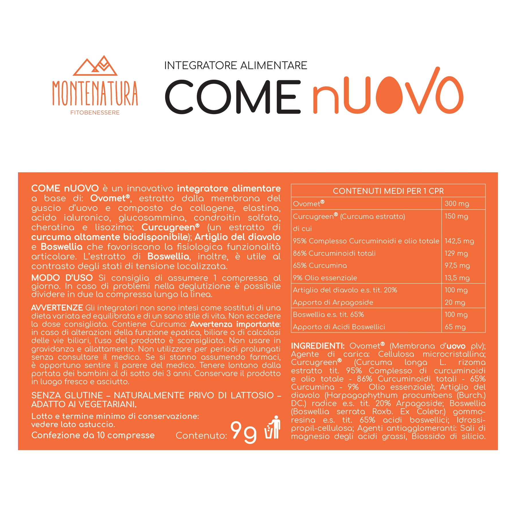 COME nUOVO è un integratore di moderna concezione che favorisce la fisiologica funzionalità articolare e contrasta gli stati di tensione localizzata, grazie alla combinazione fra le recenti scoperte scientifiche su Ovomet® e Curcugreen® e le proprietà, note da secoli, dell’artiglio del diavolo e della boswellia.